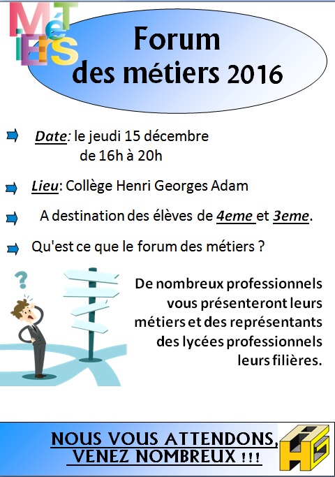 Un forum des métiers, organisé par les élèves du dispositif "Pass’ Avenir" sous l’autorité de Mme Le Goff et de M.Lasserre, aura lieu le jeudi 15 décembre de 16h à 20h.